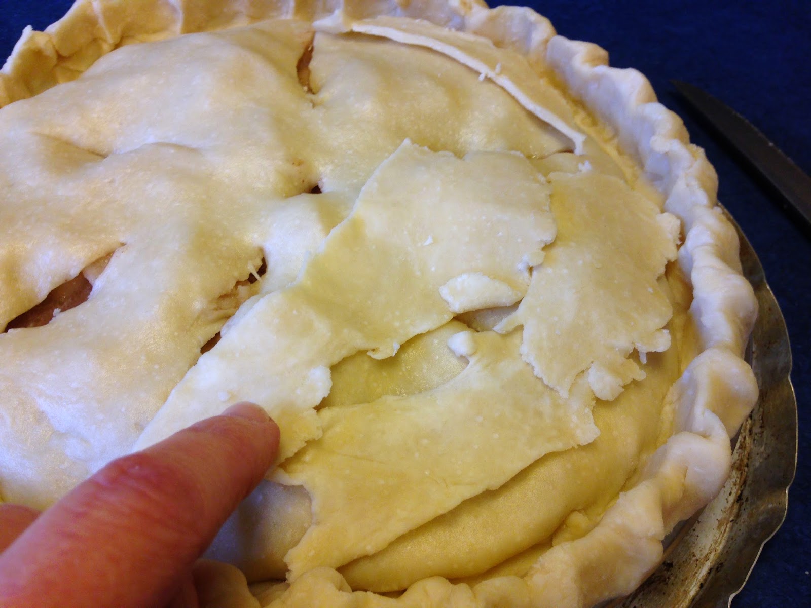 • Place over apple mixture. Cut small slits in the top crust. Trim edges of crust and flute by squeezing the bottom and top crust together and pushing between fingers to form an edge.